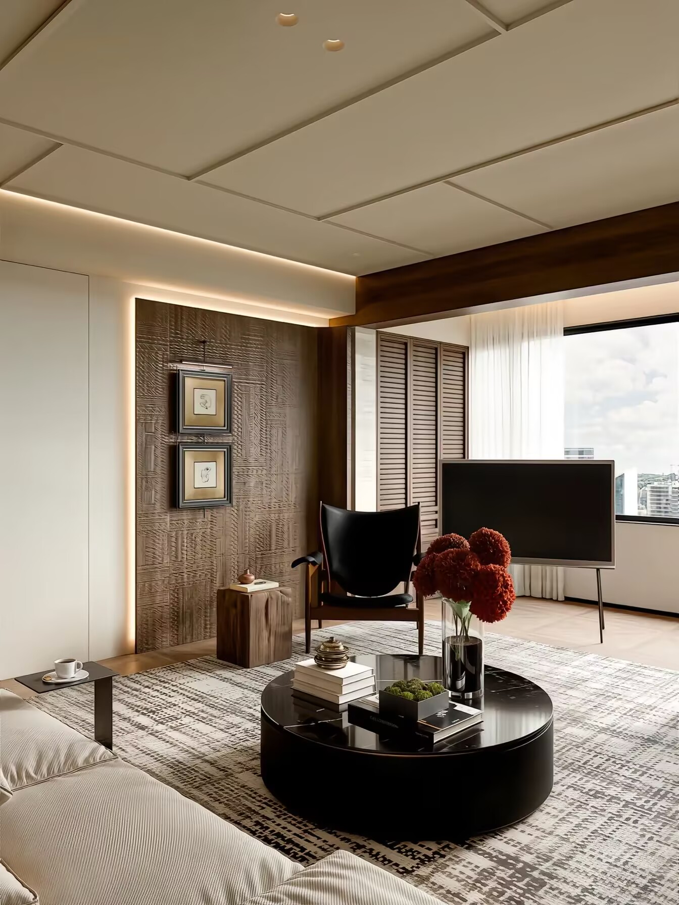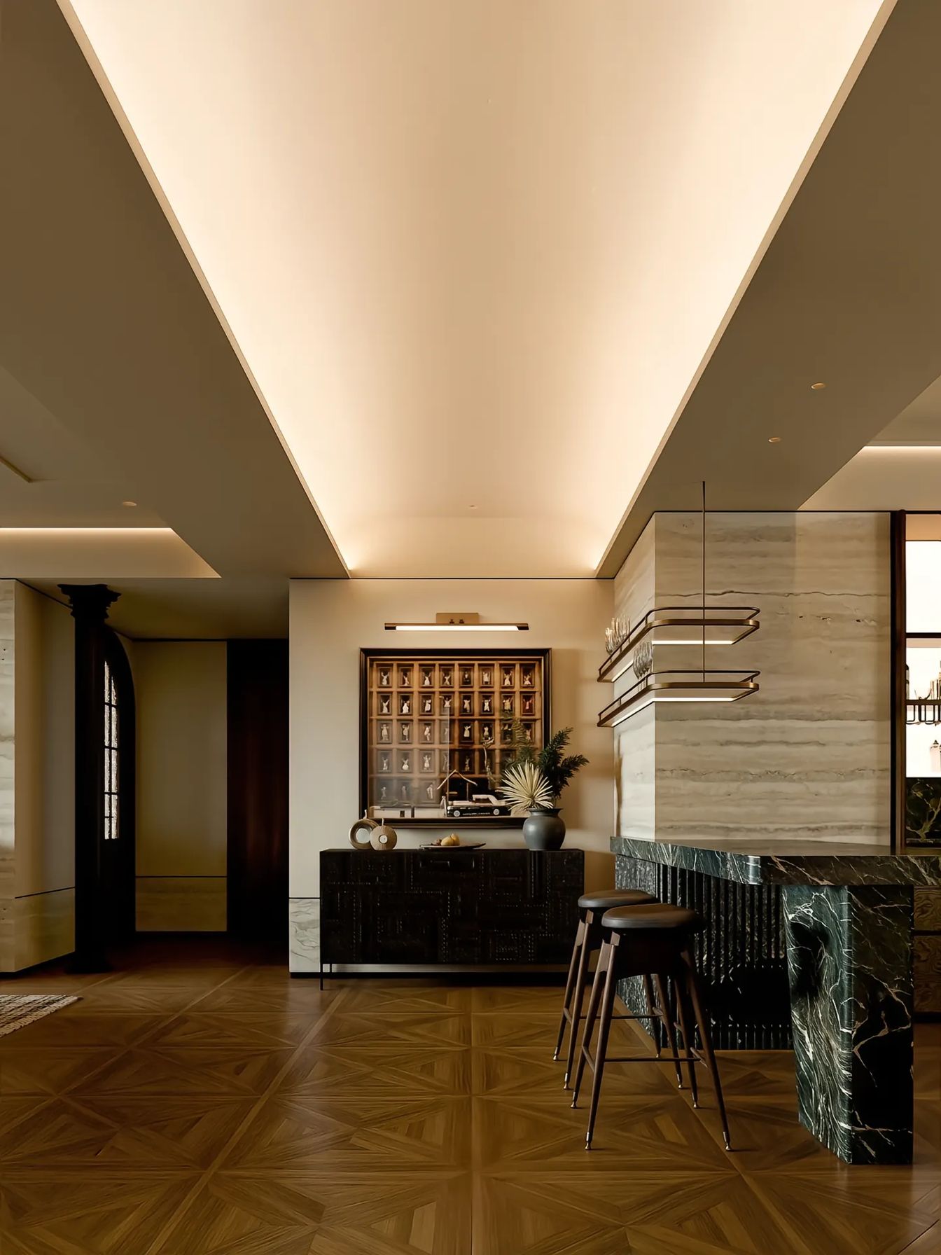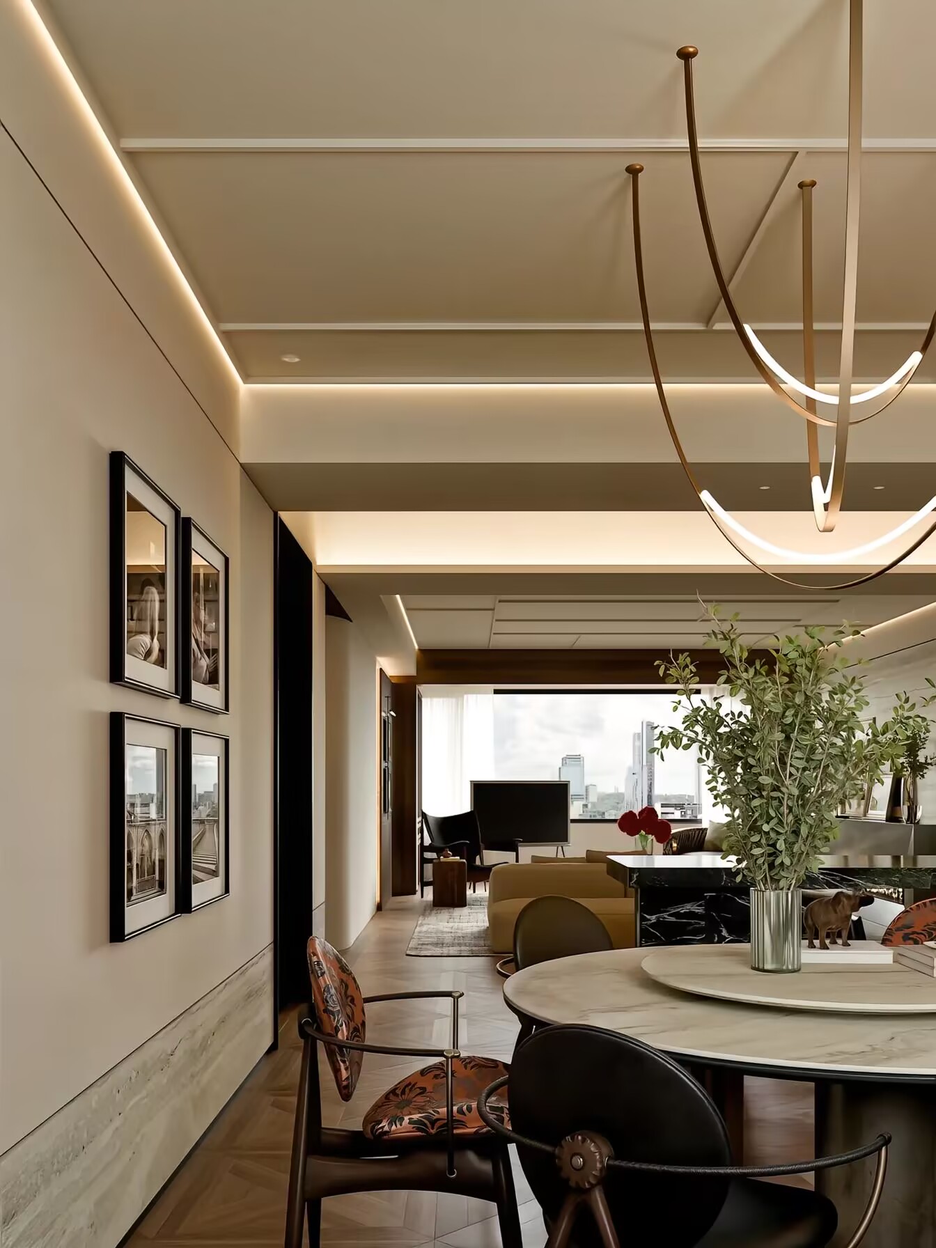 A large-scale apartment visualization focusing on open-plan living, clean geometry, and contemporary material language.